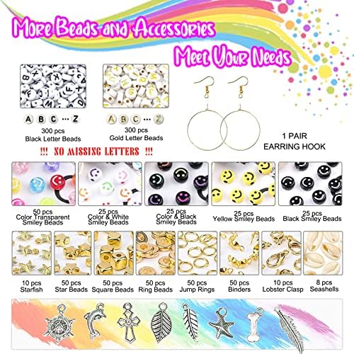 300 perline con lettera nera300 perline con lettera dorata150 perline colorate con smile50 perline piatte in oro 50 perline quadrate in oro 50 perline a stella50 ciondoli a forma di stella 50 anelli aperti 50 anelli per salto aperto20 pezzi chiusura a aragosta10 ciondoli a forma di stella marina. 8 ciondoli in argento. S1 Coppie di Orecchini4 rotoli di corde elasticheUna pinzetta e un paio di forbici