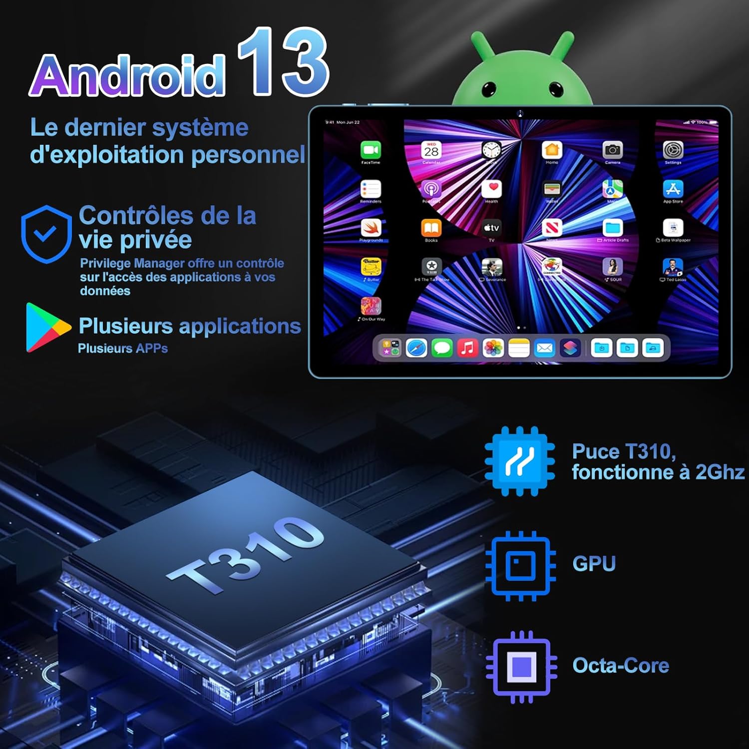【Ultimo Sistema Android 13】Il tablet G3 è dotato dell’ultimo sistema Android 13, che è veloce e ha un’ottima compatibilità. Il sistema protegge completamente la privacy dell’utente e offre ricche impostazioni personalizzate. Puoi personalizzare temi del desktop, stili di testo e icone delle app e aggiungere widget come orologio, meteo e calendario. Android 13 ti offre nuove funzionalità come multiutente, multifinestra, schermo diviso e controllo genitori