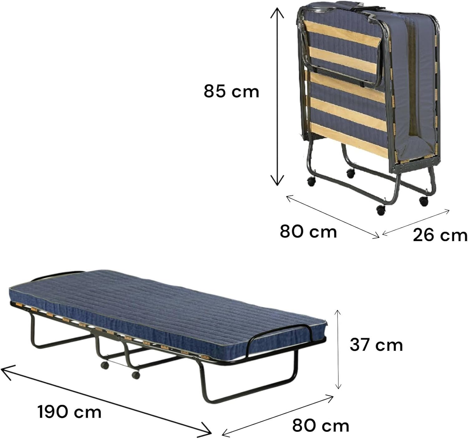 Dimensions in cm – Open bed: Length: 190 Width: 80 Height: 37 – Closed bed: 80 x 26 x 85 cm