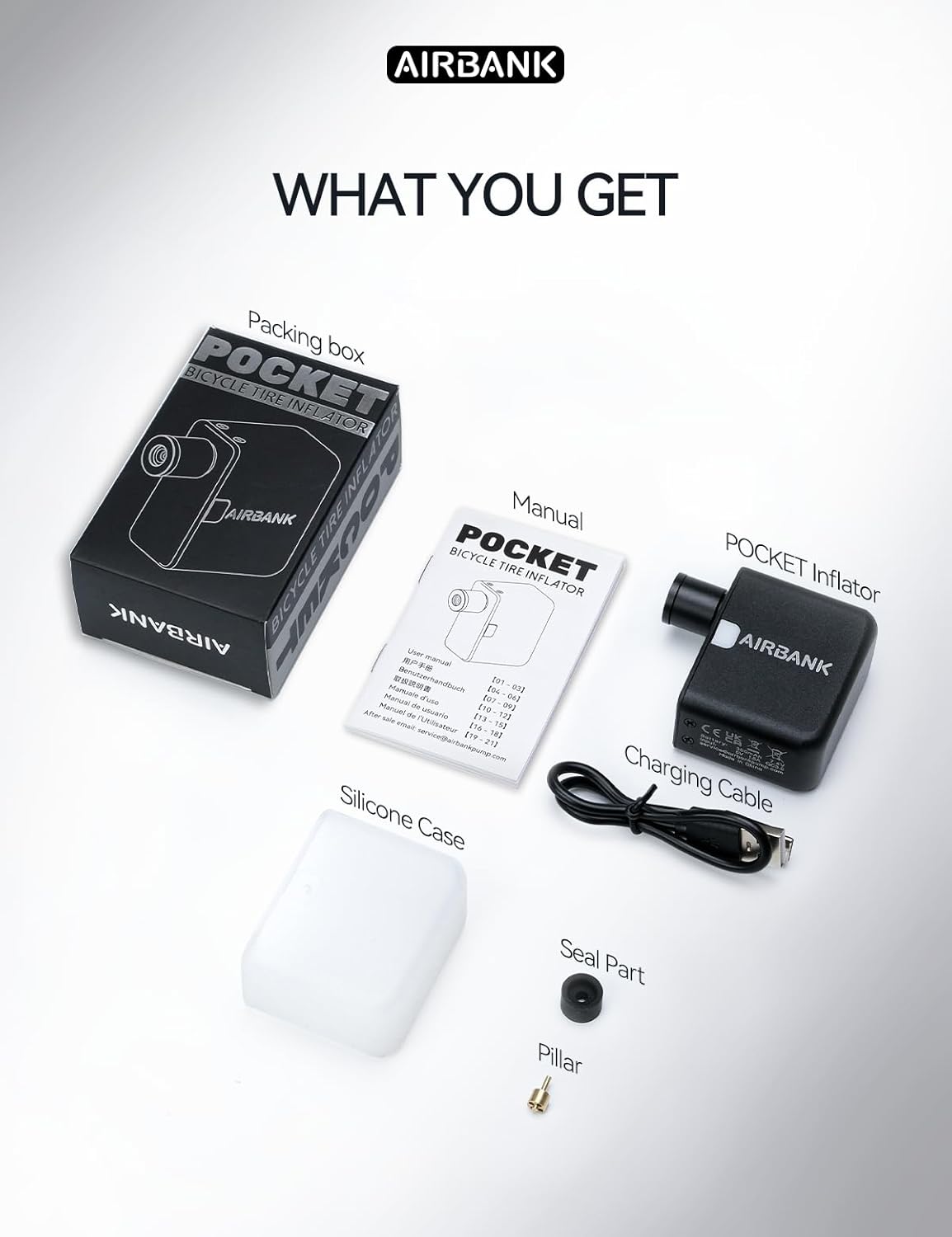 POCKET POCKET POMPA DA BICICLETTA Questa pompa ad aria elettrica è così piccola che è possibile inserire la pompa in qualsiasi borsa, ad esempio la borsa del vostro abbigliamento da ciclismo o qualsiasi borsa. Nella confezione sono inclusi anche custodia in silicone, colonna, guarnizione, cavo di ricarica