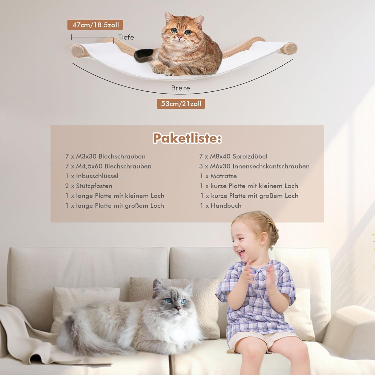 Montaggio semplice con istruzioni passo passo incluse tutte le viti, i tasselli e gli strumenti. La scala per gatti e l’amaca si montano in 30 minuti, adatte anche per i principianti del fai da te.