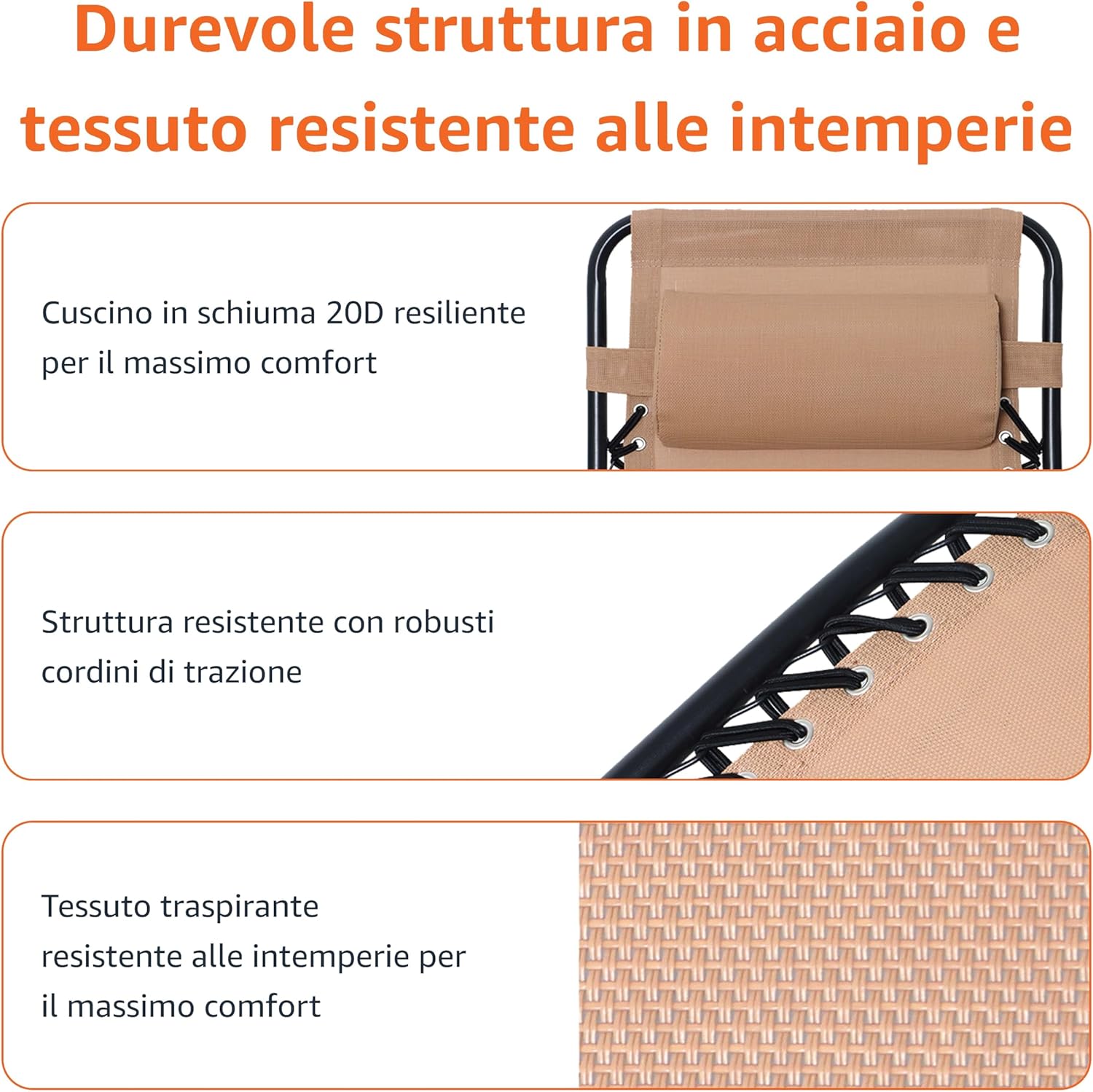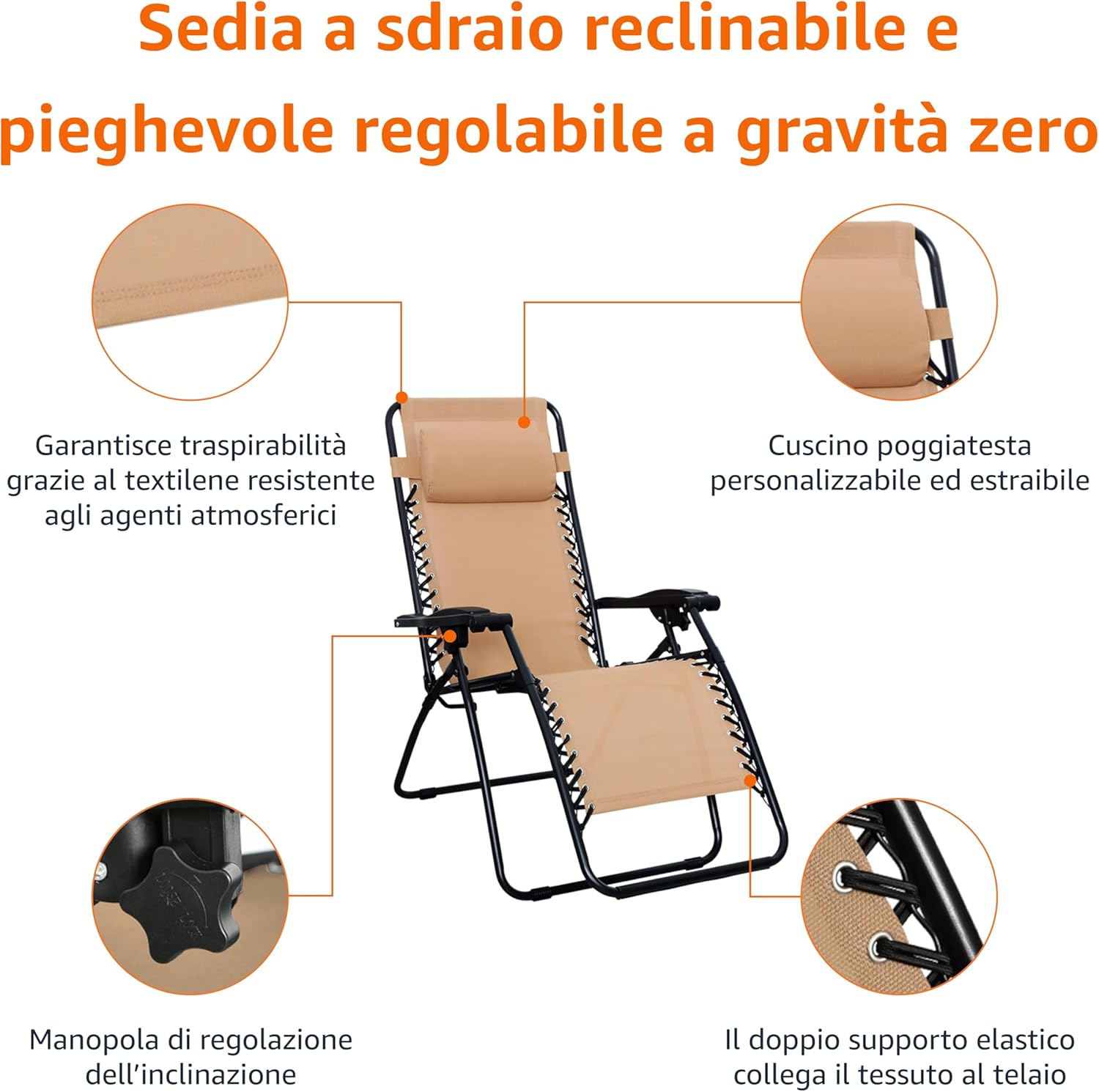 Dettagli Sedia per esterni a gravità zero Offre un sensazione rilassante di assenza di peso Telaio in acciaio verniciato a polvere In textilene resistente alle intemperie Sistema di supporto a doppio elastico che collega saldamente il tessuto al telaio Capacità di peso: 136 kg Scelta di colori