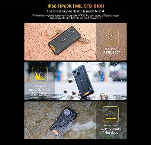 ★【IP68 | IP69K | MIL-STD-810H, Design di ultima generazione per una grande robustezza, creato per durare e resistere nel tempo:】Grazie ad un ultimo aggiornamento della robustezza di livello militare, WP20 Pro può resistere a diverse situazioni ostili. È stato creato per poter essere utilizzato ovunque. (1,5 m di profondità in acqua, impermeabile, 1,5 m di altezza di protezione anticaduta, protezione antipolvere a 360°)