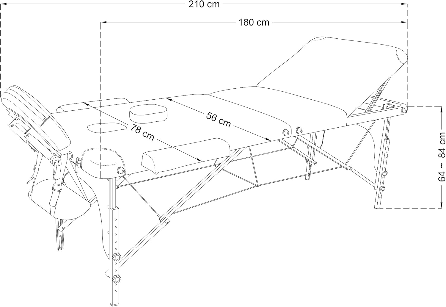 Larghezza 56 cm. (con poggiabraccia 78 cm.) – Peso lettino circa 13,3 kg con accessori 14,5 kg