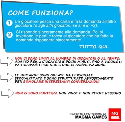 ❓ COME FUNZIONA? Nessuna regola, nessun punteggio e niente domande trabocchetto. Pesca una carta, fai la domanda e ascolta. Ben 100 coloratissime Carte Conversazione per parlare, condividere divertenti esperienze e conoscere gli altri.