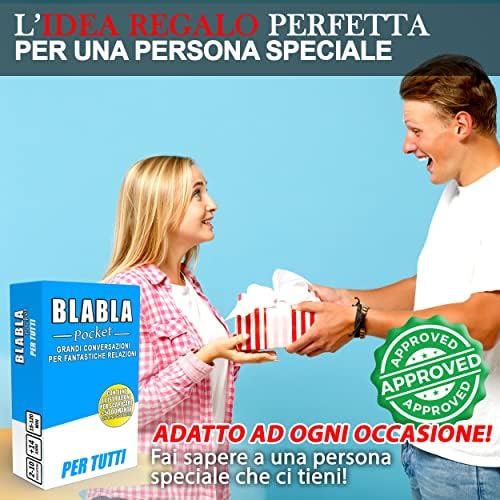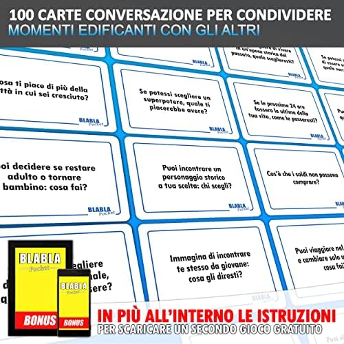 🎉 TANTE EDIZIONI DIVERSE: BLABLA Pocket ha una linea di giochi di società creativi pensati apposta per fare conversazione. Scopri anche l’EDIZIONE PER COPPIE e quella PER FAMIGLIE, tutte pensate per passare momenti edificanti con le persone intorno a te!