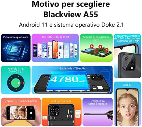 Blackview A55 6.5″ HD+ Smartphone Android 11 Dual SIM 4G Batteria 4780mAh4-in-1 Sistema di Navigazione WiFi/ 3 Slot/Face ID
