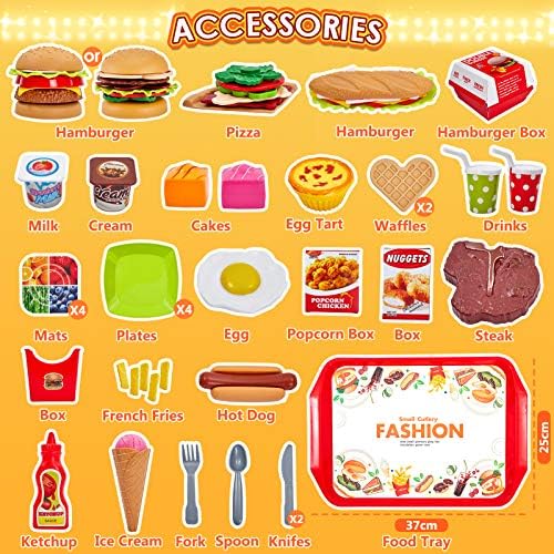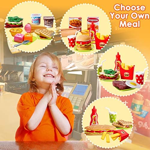 【63 Pezzi Giochi Cibo per Bambini】- 2 in 1, Dolce e Cibo giocattolo per bambini. Compresi hamburger, pizza, gelato,torte, patatine fritte, forchette, coltelli, cucchiai, piatti, piatti grandi, ecc.