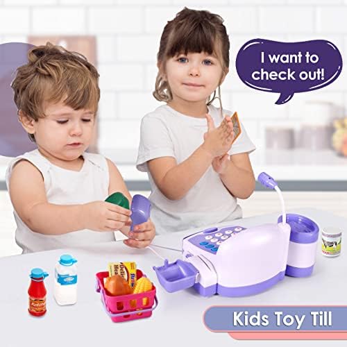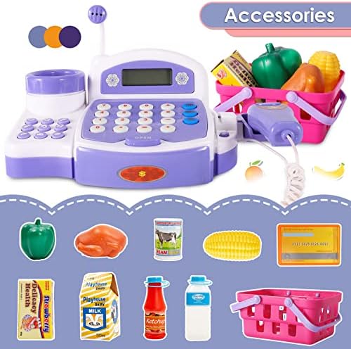 【Cassa Giocattolo per bambini】 – Accessori per negozi, tra cui elettronico cassa, carta di credito, soldi finti, cestino della spesa e giocattoli alimentari come peperoni verdi, mais, scatola di torta, ketchup, latte, acqua minerale, ecc. Un’ampia gamma di accessori per offrire ai bambini un’esperienza di shopping più realistica.