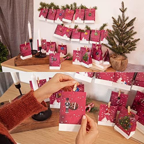🎄 FACILISSIMO DA REALIZZARE: 24 bustine decorative stampate (18x9x5,5cm, vuote), 24 mollette in legno e di cordoncino in juta per appendere, oltre a graziosi numeri e soggetti natalizi adesivi