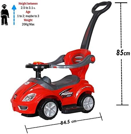 La maniglia può essere rimossa quando il bambino è pronto per correre I pulsanti sul volante attivano suoni divertenti con 5 diverse musiche Sedile molto comodo con guardia di sicurezza ruote con striscia di trazione in gomma Fascia di età consigliata da 12 mesi a 4 anni montaggio richiesto; Istruzioni chiare incluse