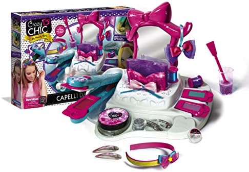 Un salone di bellezza con un grande specchio, una piastra colora capelli, un fantastico gel glitterato, clip e vano porta accessori.