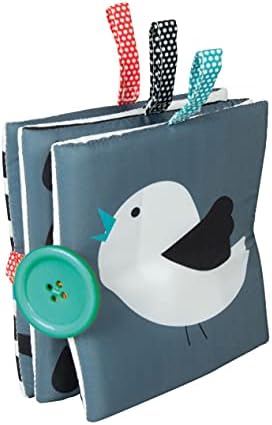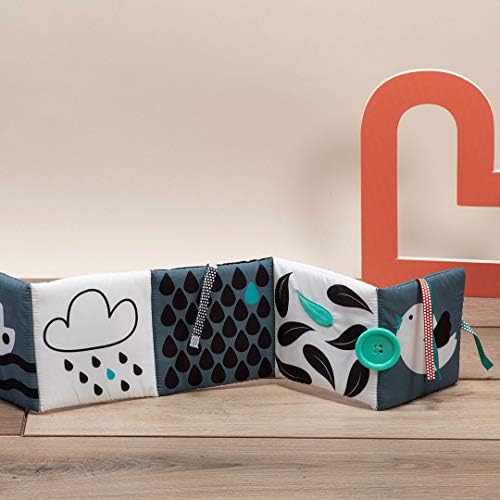LIBRO SENSORIALE: il libro si apre e ogni pagina contiene un’immagine e un’attività diversa per stimolare i primi sensi, come uno squeak, un crinckle e uno specchietto per attirare l’attenzione del bambino e svilupparne la percezione uditiva