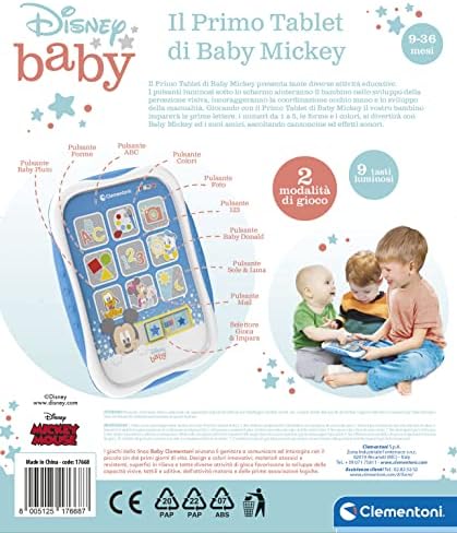 Un pad elettronico parlante per piccolissimi che è reso ancora più bello dal tenerissimo Disney Baby Mickey. Un simpatico tablet come quello dei grandi ma ricco di canzoncine e divertenti effetti sonori e luminosi. Con 9 tastoni luminosi e 2 modalità di gioco, insegna i primi numeri, le prime lettere, le forme, i colori e anche l’inglese. La membrana soft touch del tablet dedicato alla prima infanzia garantisce una maggior fruibilità anche per i più piccoli. Un gioco educativo ed interattivo che stimola la percezione visiva e uditiva e supporta lo sviluppo del linguaggio. Il gioco è pensato per catturare l’attenzione del piccolo e incuriosirlo e per essere portato ovunque si voglia. Il pad ha un design ergonomico pensato per facilitare la presa da parte del bambino. La scelta cromatica, che privilegia i colori tenui, è frutto di un’attenta ricerca sui trend del momento, per garantire un prodotto sempre al passo con i tempi. Un gioco elettronico parlante perfetto a partire dai nove mesi.