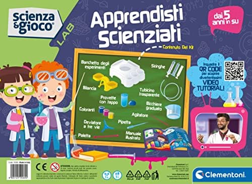 CONTENUTO: un banchetto di gioco, strumenti da laboratorio, ingredienti, una vera bilancia e un manuale scientifico illustrato.