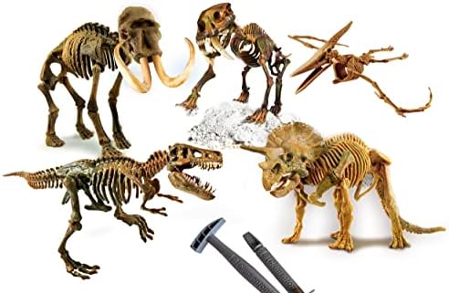 Grazie al martello e allo scalpello inclusi nella confezione il bambino potrà scavare nel blocco di terreno e riesumare i “fossili” di alcuni animali preistorici come un vero paleontologo.