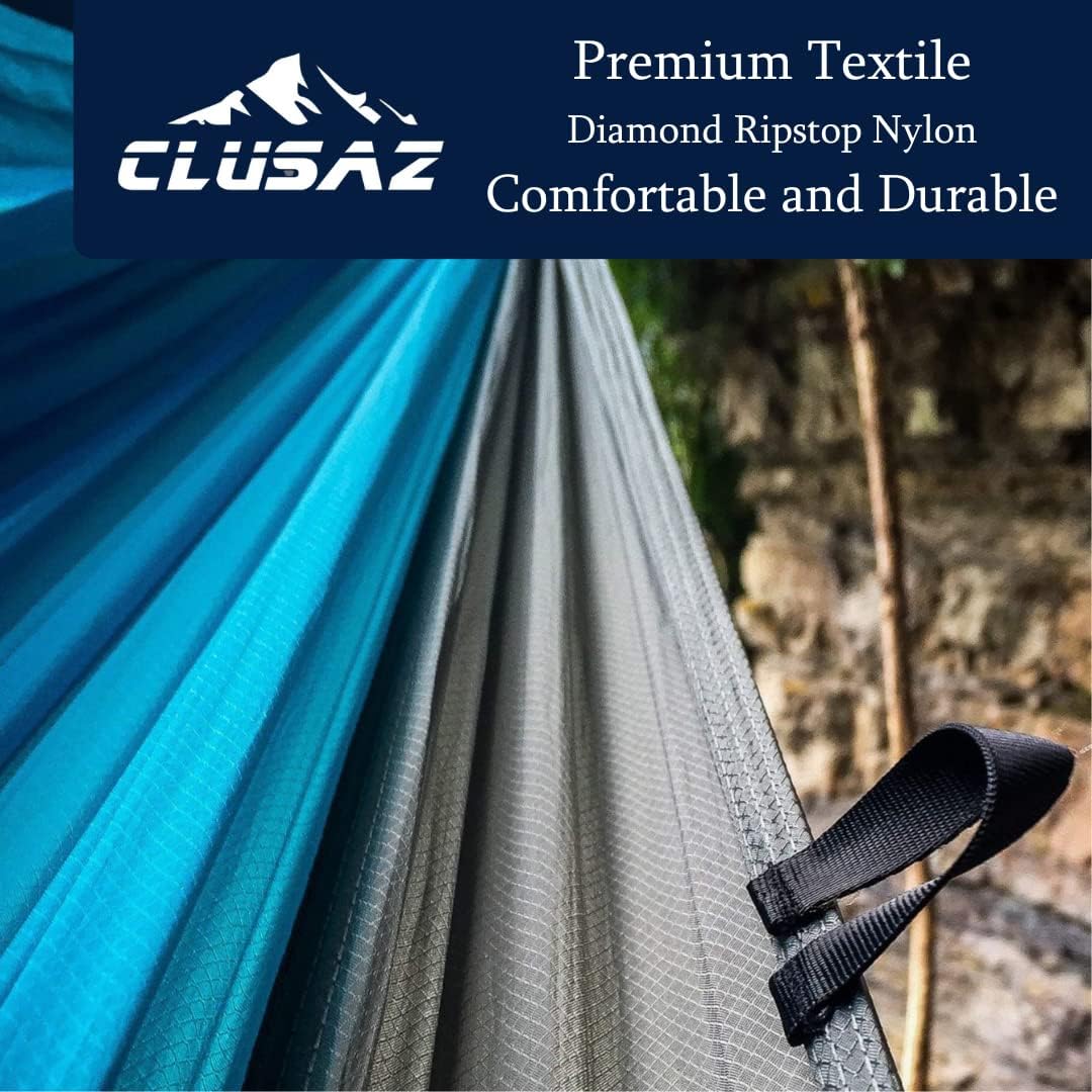 ✅SUPER STRONG AND SAFE – Unlike standard hammocks, Clusaz hammocks are made from a premium fabric that is more breathable and tear resistant – 70D diamond shaped ripstop nylon. Triple stitched interlocking seams for superior strength Our unique shaft strap design has a breaking strength of 500kg (1100lbs): twice as strong as competitors, for added safety, comfort and durability!