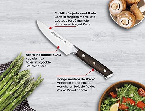 Coltello resistente e molto comodo: il coltello da cucina kimura 3 claveles ha una lama forgiata e martellata che lo rende un coltello da cucina molto forte, il manico è fatto di legno pakka molto resistente al calore e all’umidità
