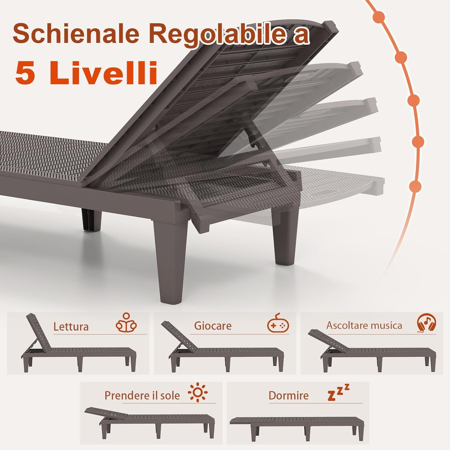 【Schienale Regolabile】Lo schienale regolabile in 4 livelli offre comfort personalizzato per diverse attività, come prendere il sole, leggere, giocare, dormire e altro ancora. Puoi regolare liberamente lo schienale nella posizione desiderata per un migliore relax.