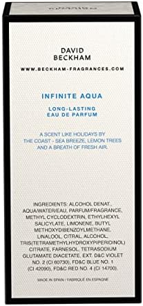 David Beckham, Eau de Perfume Infinite Aqua, Profumo Uomo, 100 ml. Una fragranza acquatica aromatica. Una fresca ondata di note verdi agrumate di limone e foglie di fico mescolate con un accordo di brezza oceanica acquatica. Ispirato a un viaggio lungo l’autostrada della costa del Pacifico, dall’infinità dell’oceano e dall’esperienza, da una camminata lungo la spiaggia, della fresca brezza marina salata. Un inno alla freschezza del mare, è una sensazione unica di infinito rinvigorimento.