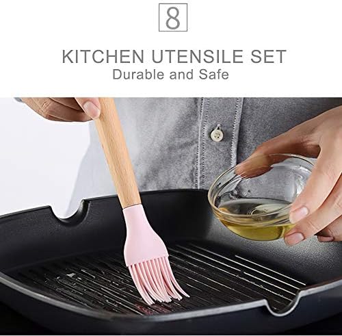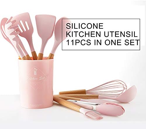 Decdeal – Set di 11 utensili da cucina in silicone antiaderente, con manico in legno Rosa