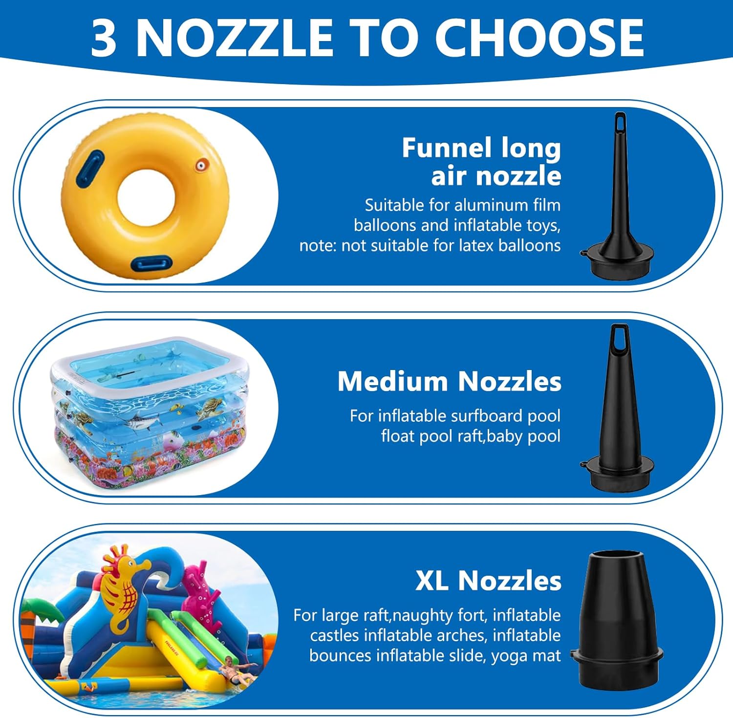 3 DIFFERENT NOZZLE SIZES – Battery operated rechargeable air pump offers three different nozzle sizes to meet your pumping needs. Electric air pump ideal for air beds, mattresses, floating rings.