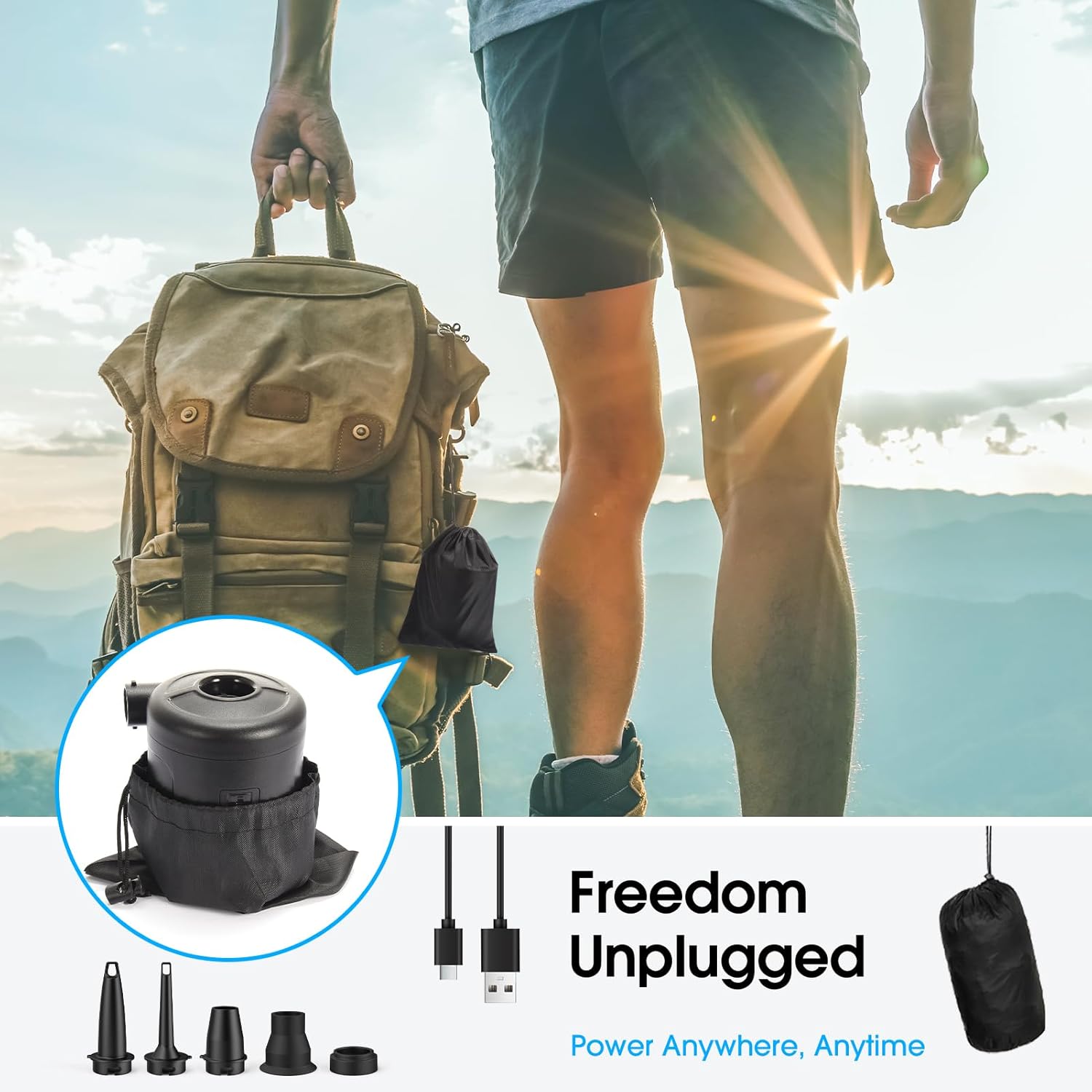 【Compact & Cordless Design】Unlike traditional air pumps that require a constant power source, this cordless air pump is designed for both indoor and outdoor use. Whether you are at home, at the beach, camping or at a party, its lightweight and portable design makes it easy to carry in your backpack without adding bulk.