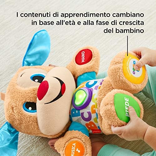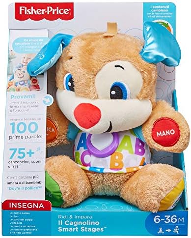 Un grande amico ascolta, ti tiene compagnia, e ti insegna cose che non sapevi, come ruggire come un leone o contare fino a dieci. Il nuovo cucciolo del tuo bambino, il Cagnolino Primi Passi Ridi & Impara Smart Stages, sa come essere un buon amico. Chiacchiera, si illumina, ama coccolare e può dire più di 100 prime parole, comprese parti del corpo, colori, numeri e molto altro.