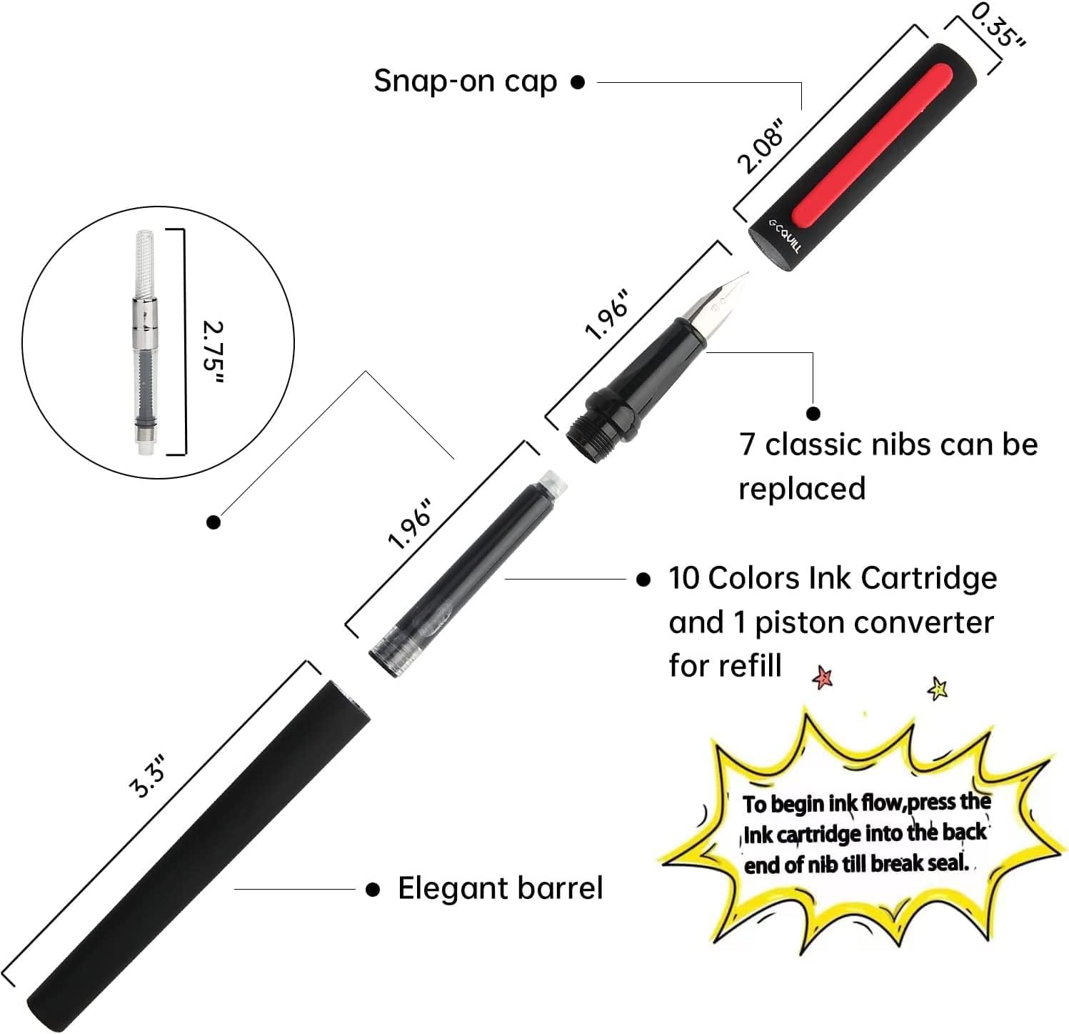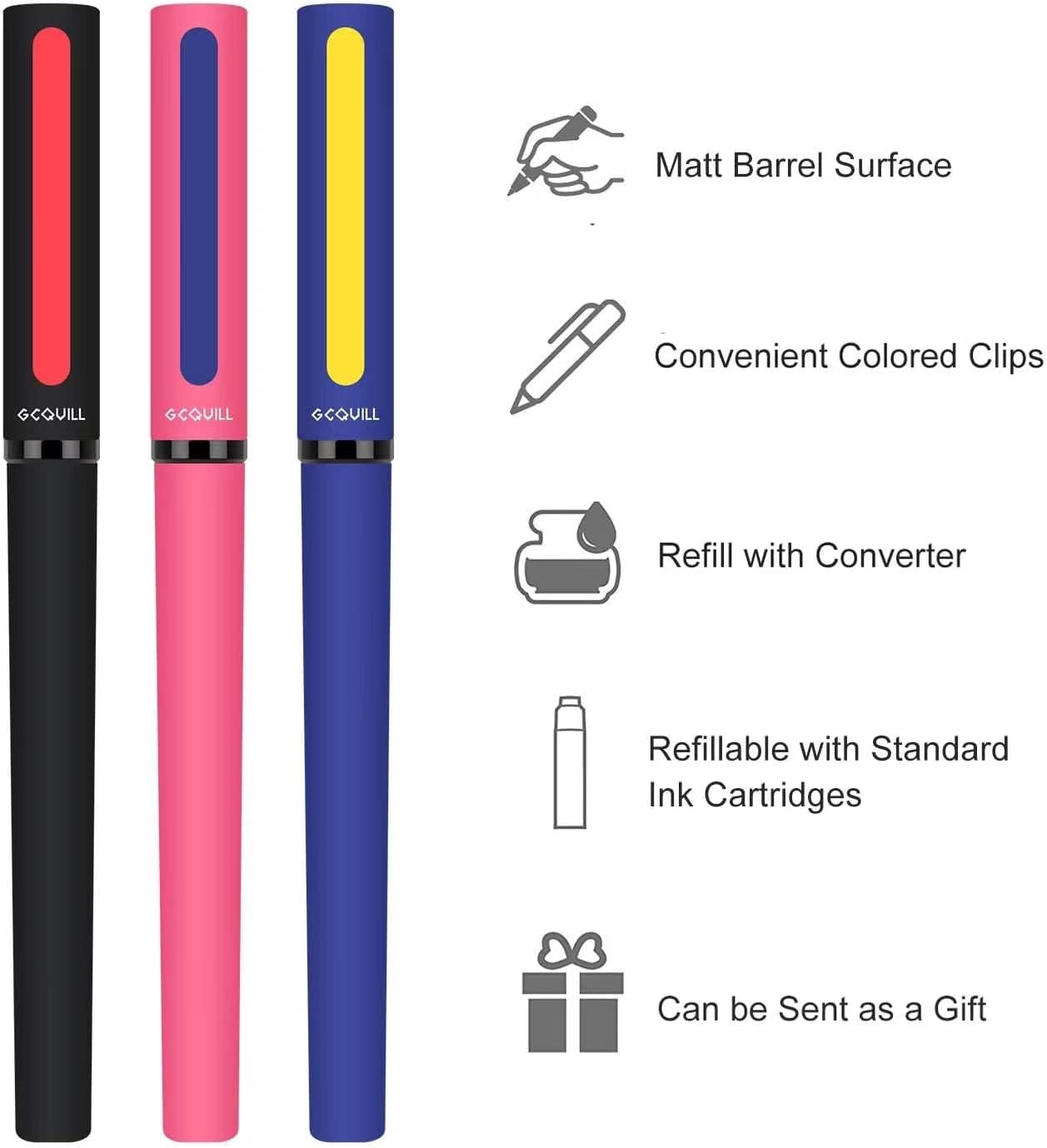 3 penne stilografiche colorate: le 3 penne stilografiche includono i convertitori a pistone. Puoi estrarre il tuo inchiostro preferito con i convertitori a pistone. Le penne stilografiche nere, blu navy e rosa sono create per varie occasioni e stati d’animo. La classica penna stilografica nera con clip rossa può essere utilizzata in ufficio formale. La penna stilografica causale blu navy con clip gialla può essere utilizzata nell’uso personale quotidiano o nella pratica calligrafica. La penna rosa giocosa con clip blu navy offre una colorazione piacevole e una divertente creazione artistica. Colori diversi per il tuo umore vario.