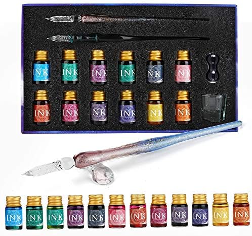 Sofisticato set calligrafia: il sofisticato set calligrafia comprende 2 penne in vetro cristallo, 12x7ml colori assortiti di inchiostro, 1 portapenne in vetro e 1 tazza detergente. Ideale per biglietti di auguri, poster, firme, calligrafia, disegno, decorazione e regalo.