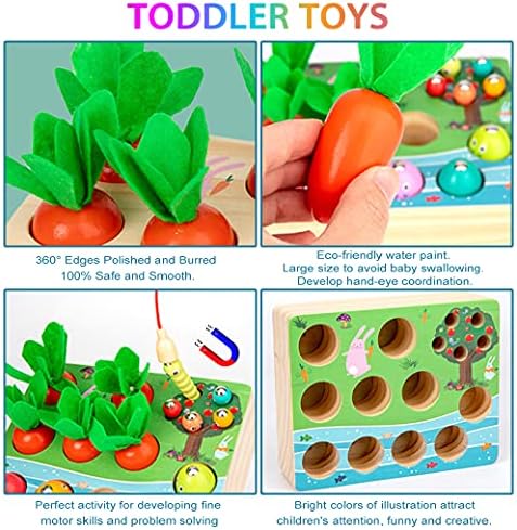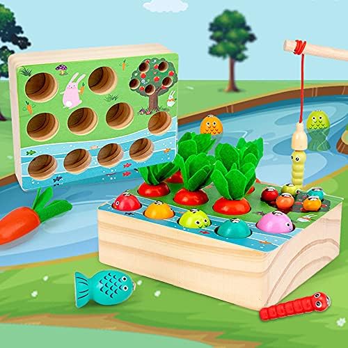 Giocattoli educativi per bambini – Il vivace giocattolo in legno colorato ha fori di diverse dimensioni per adattarsi a carote/vermi/api; Carote e vermi incoraggiano i bambini a distinguere i colori. Le canne da pesca allenano le capacità motorie dei bambini. Grandi giocattoli sensoriali per le bambine da imparare nel gioco. Promuove la coordinazione occhio-mano, la destrezza e la concentrazione dei più piccoli.