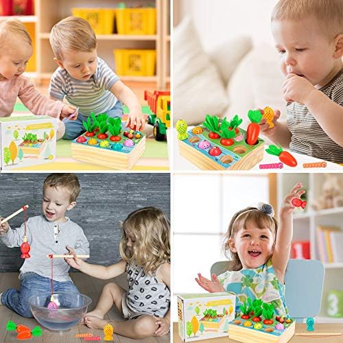 Giocattoli Montessori per bambini dai 2 ai 3 anni – Questi giocattoli in legno hanno colori vivaci. Giocattoli accattivanti per bambino. 3 divertenti temi di agricoltura: raccolta di carote, pesca in piscina e cattura di vermi. Contenuto: 2 canne da pesca, 5 bruchi, 5 pesci, 5 carote, 1 base in legno, 1 bella scatola di imballaggio. Materiale: legno. La foglia verde della carota è fatta di feltro, un giocattolo innocuo per i più piccoli.