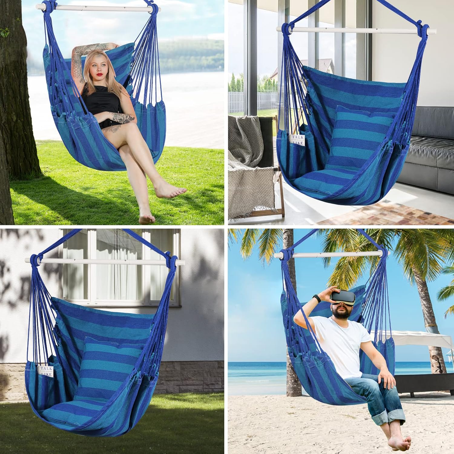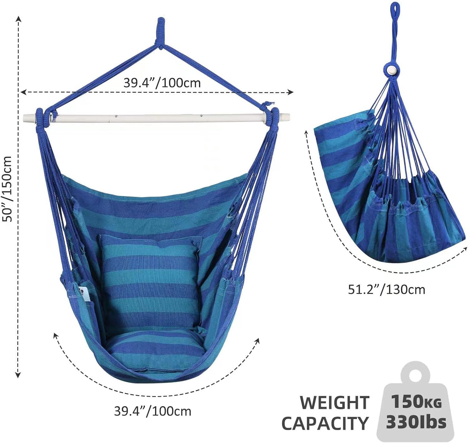 La sedia sospesa è realizzata in morbido cotone, con due cuscini per un maggiore comfort. Super comodo e rilassante per sedersi in