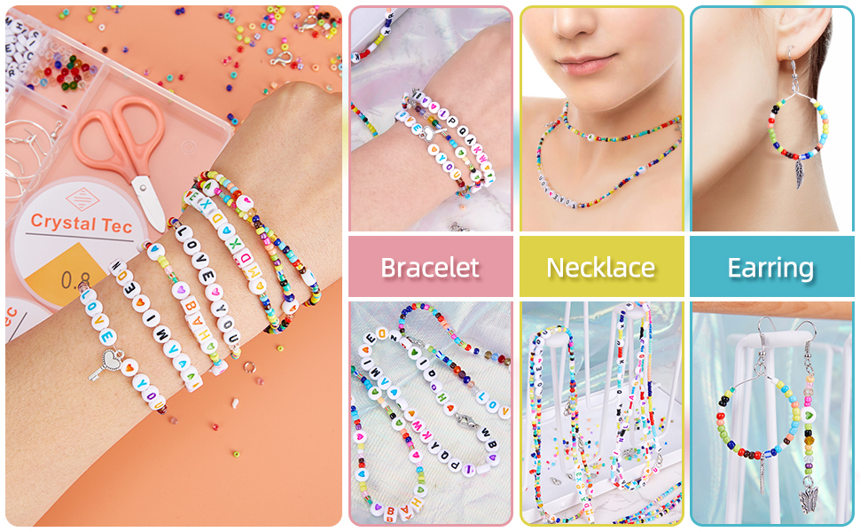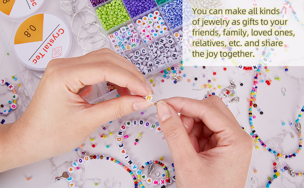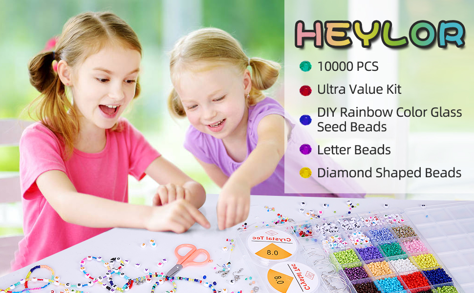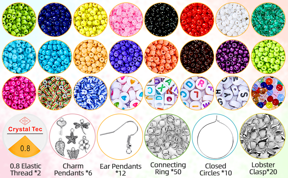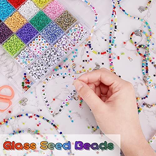 ✨【Set di perline piccole】 Il set di perline contiene 19 colori di perline di vetro, 10.000 in totale. Perline di lettere dalla A alla Z, 10 perline per ogni lettera, 50 perline a forma di cuore e 50 perline a forma di diamante, 400 in totale. Questo kit di perline contiene anche accessori essenziali come forbici, cordoncino elastico, cerchi chiusi, ciondoli fantasia, orecchini e chiusure a moschettone per gioielli fai da te.