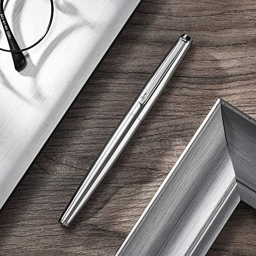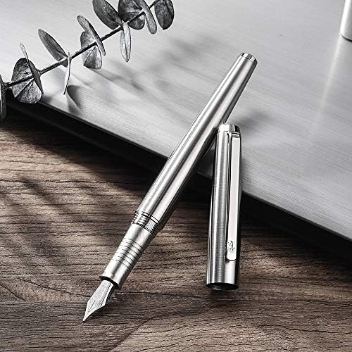 HongDian – Penna stilografica in acciaio INOX con punta fine con convertitore e scatola di metallo