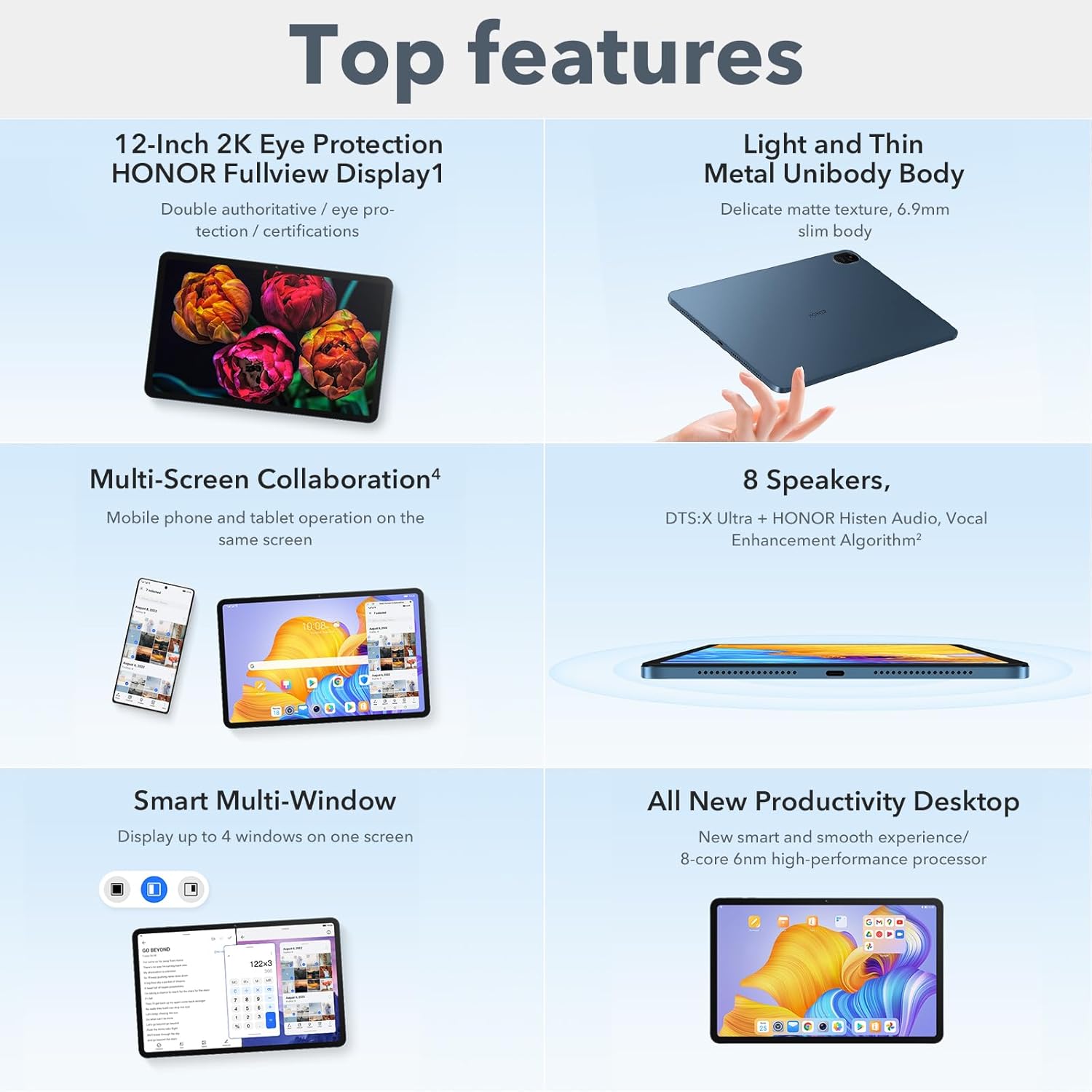 【Batteria a lunga durata】 Ricarica rapida da 22,5 W e grande batteria da 7250 mAh. 14 ore di ascolto di audiolibri (su uno schermo luminoso), 14 ore di video di auto-apprendimento offline o 10 ore di lezioni online. Nota: supporta fino a 22,5 W di ricarica cablata utilizzando il caricabatterie e il cavo HONOR da 22,5 W.
