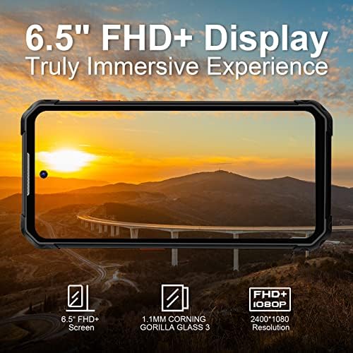 📱【Schermo FHD+ da 6,5″ & Schermo Posteriore da 1″】 Abbiamo aggiunto un display da 1 pollice sul retro del rugged smartphone che mostra la data, l’ora e la batteria rimanente, in modo da non dover controllare il smartphone in continuazione. Lo schermo da 6,5 pollici è realizzato in vetro Corning Gorilla 3 e ha una risoluzione di 2400*1080, in modo da poter vedere chiaramente le immagini sullo schermo anche alla luce del sole