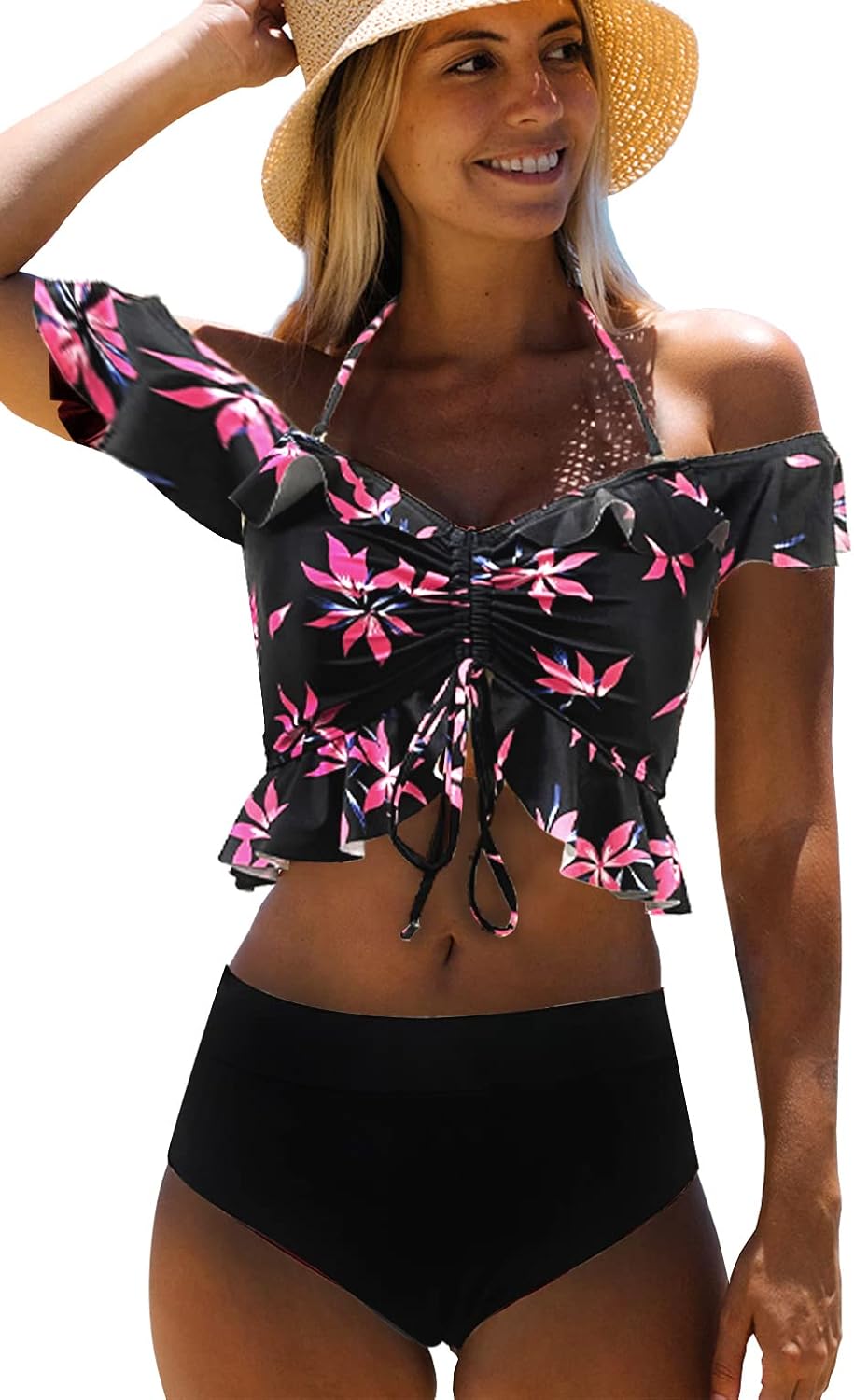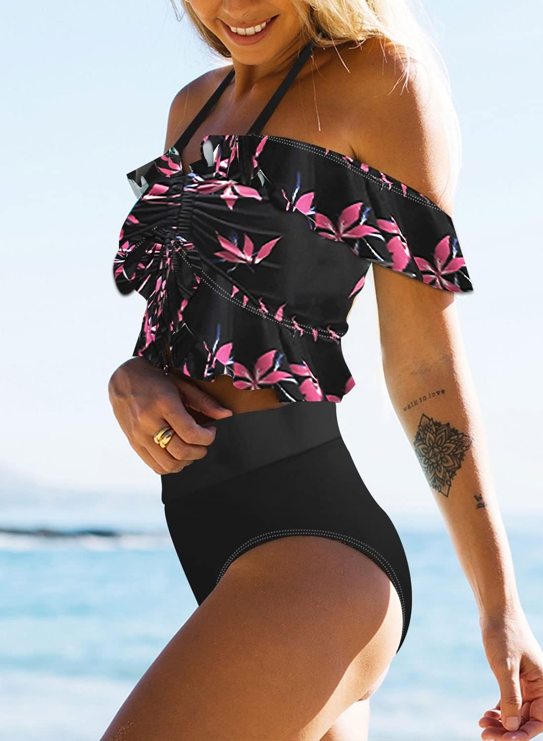 JFAN Costume da Bagno Donna off Shoulder Due Pezzi Bikini A Vita Alta Bottom Increspato Stampa Floreale Halter Ruffle Coordinati