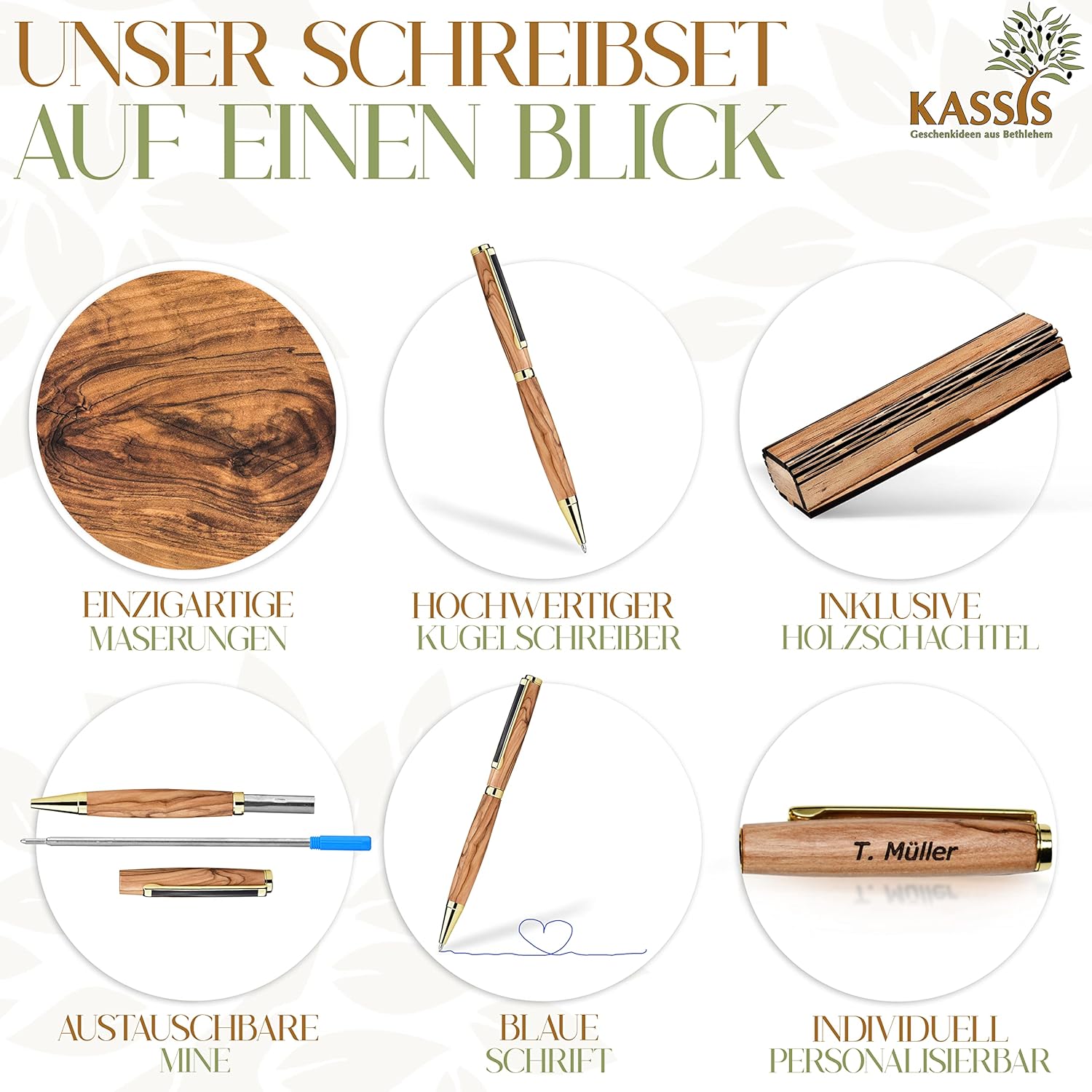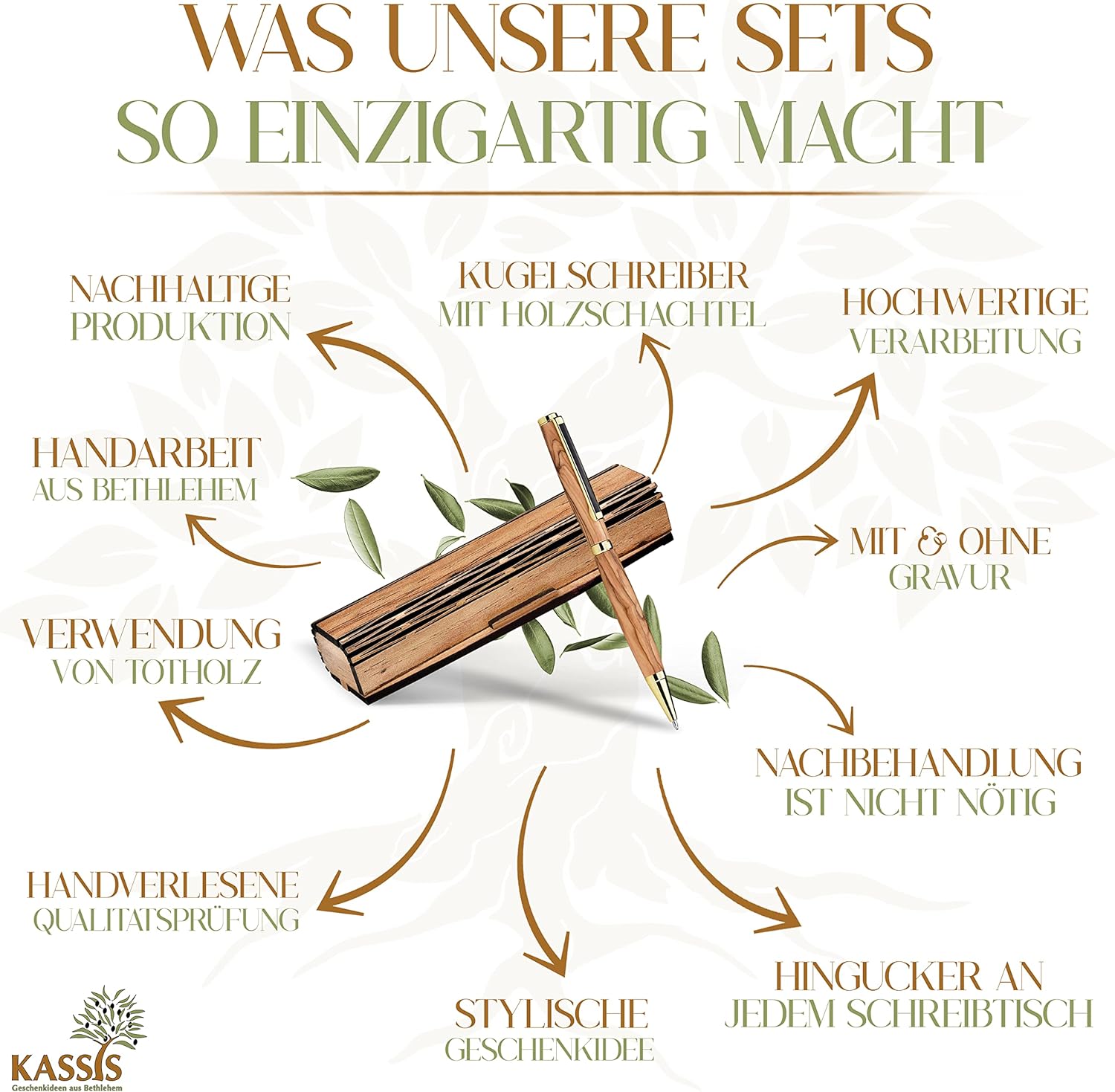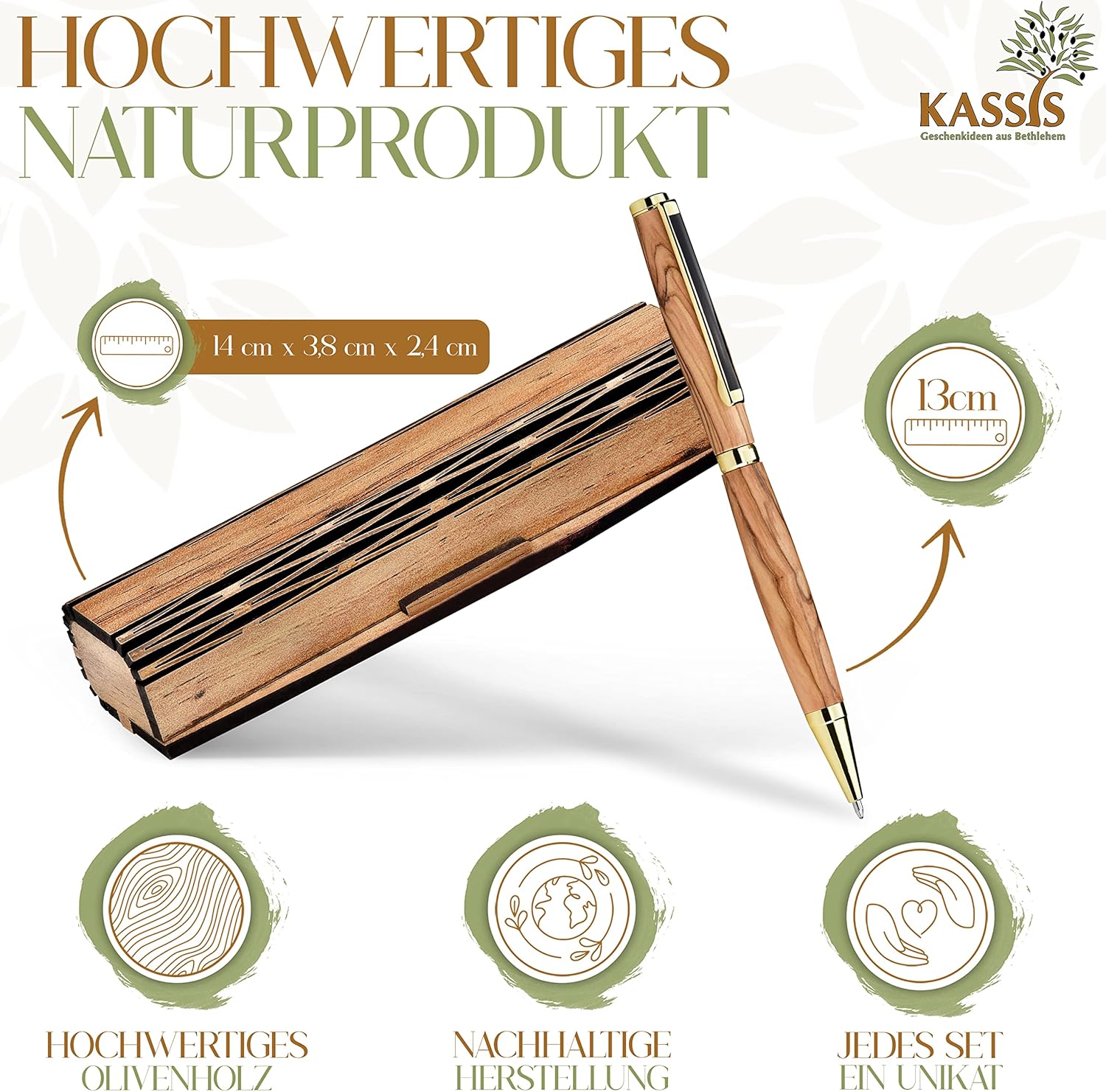 Le nostre penne sono fatte a mano a Betlemme. I produttori prestano particolare attenzione al fatto che le venature del legno vengono mostrate al meglio. Ciò significa che ogni pezzo è unico, con le venature uniche del legno d’ulivo. Il legno utilizzato proviene esclusivamente da alberi già morti. Pertanto, nessun albero viene abbattuto per la produzione. In questo modo garantiamo anche la sostenibilità del nostro prodotto.