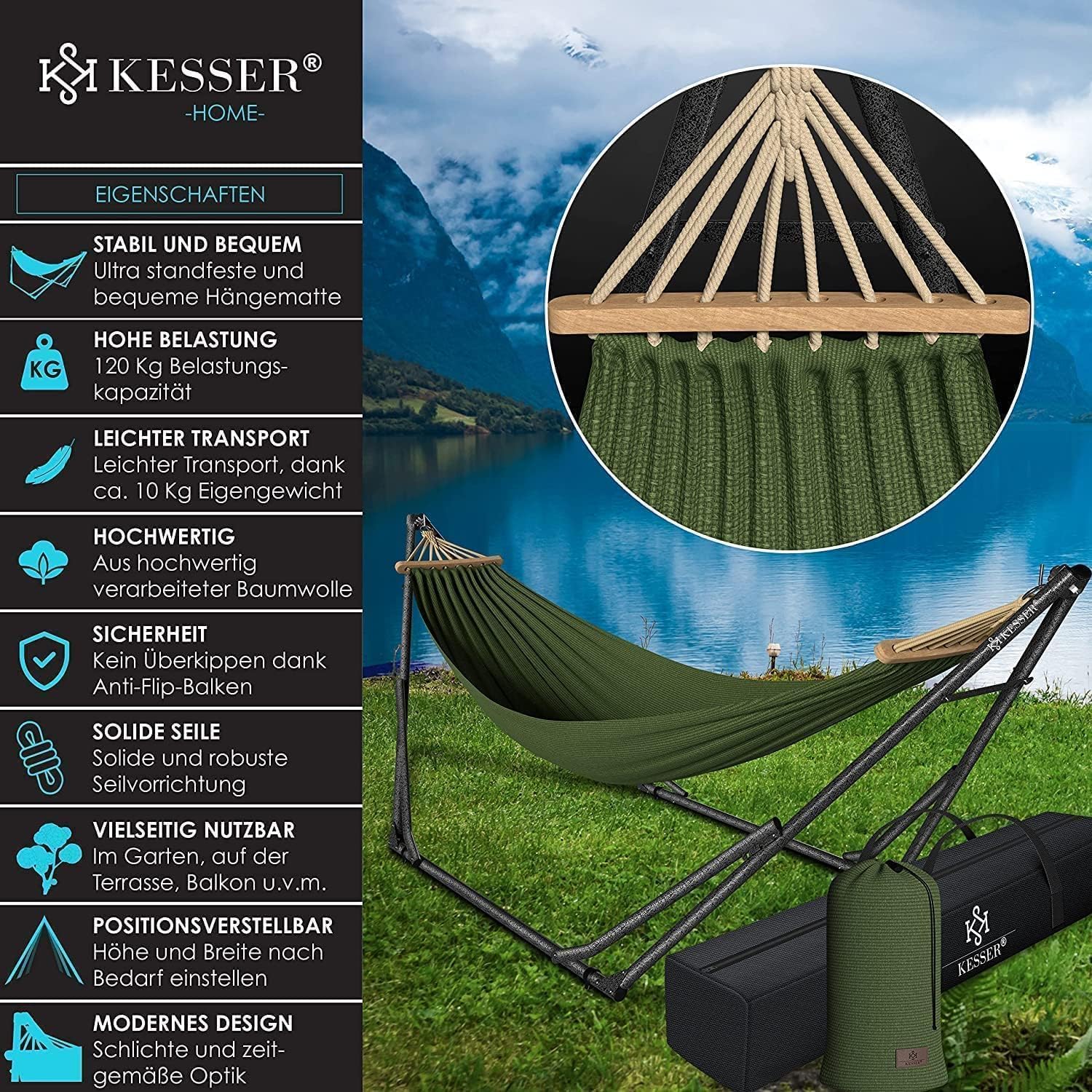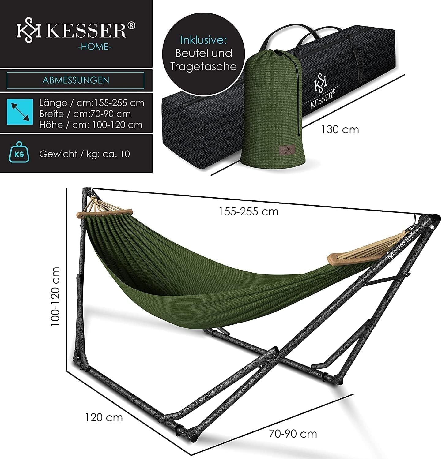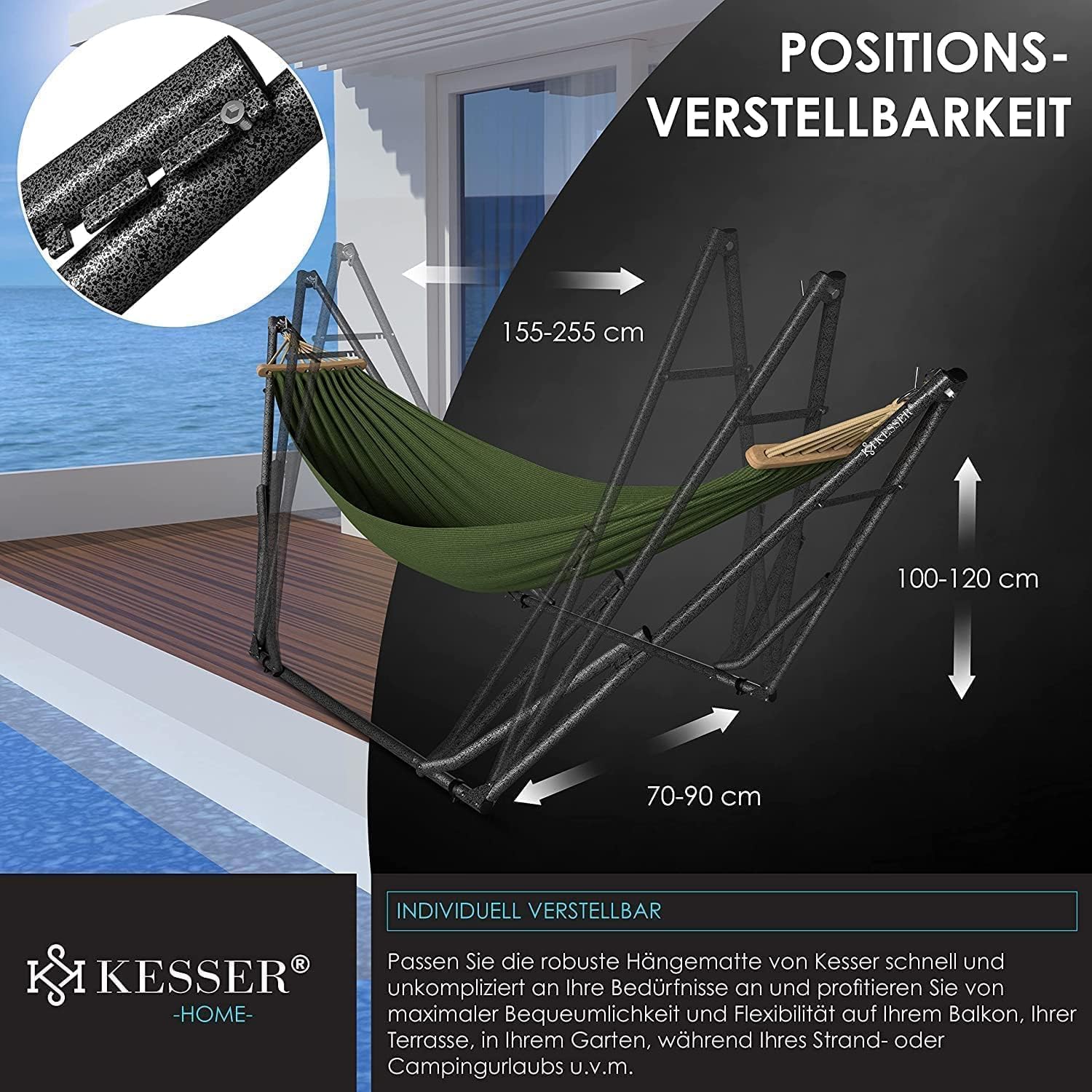 Facile e veloce: si adatta rapidamente e facilmente alle tue esigenze e approfitta della massima comodità e flessibilità sul tuo balcone o giardino. Grazie alla struttura innovativa, oltre all’altezza, è possibile aumentare o ridurre la larghezza dell’amaca. Grazie al meccanismo pieghevole è possibile piegare l’amaca in modo rapido e semplice e riporla nella grande borsa KESSER e nella borsa.