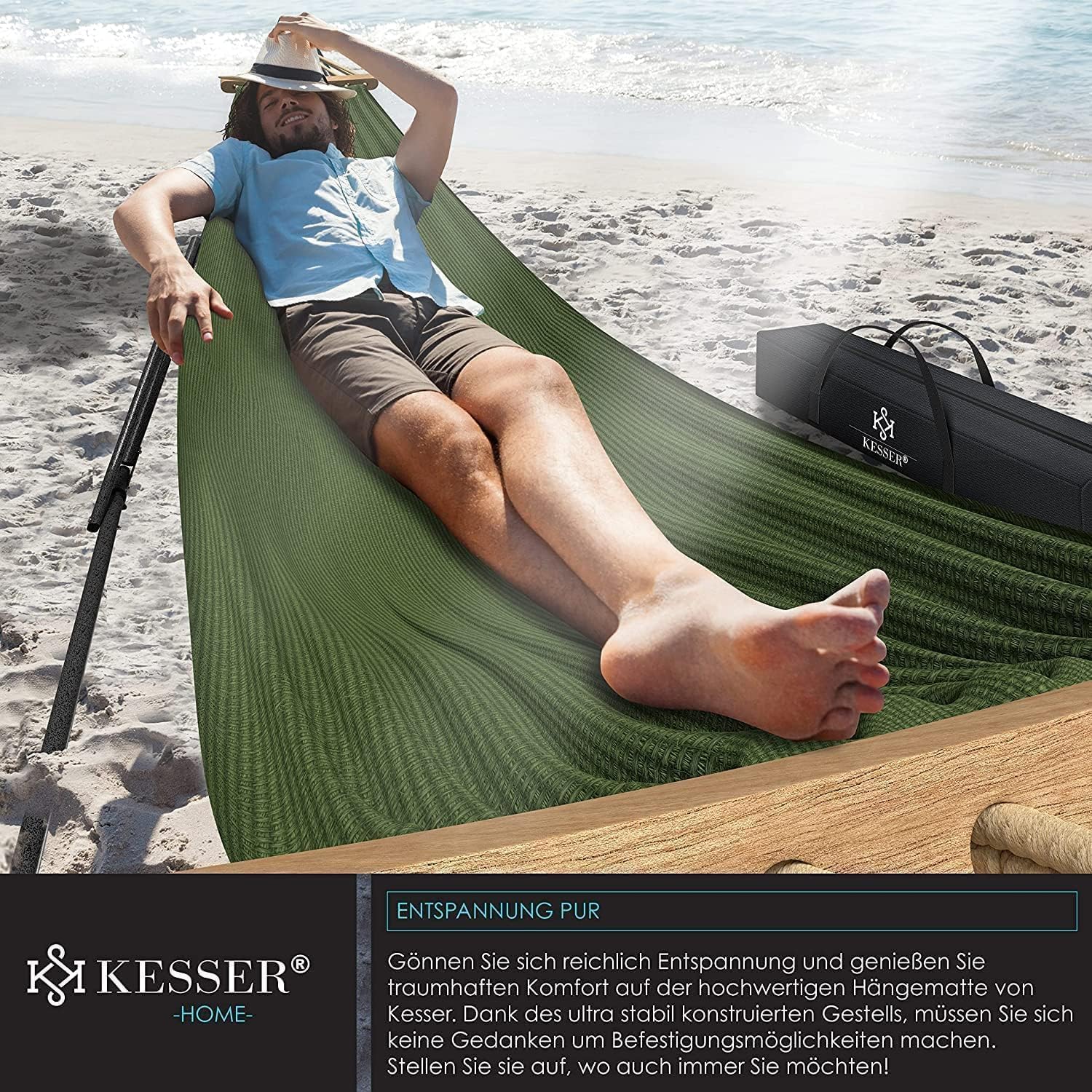 Facile da usare: rilassatevi sia all’interno che all’esterno con l’amaca da viaggio estremamente robusta e resistente di KESSER. Grazie all’acciaio legato è possibile lasciare il telaio della nostra amaca in giardino anche in caso di maltempo, grazie al materiale di alta qualità l’acqua scivola via sulla superficie e impedisce la formazione di ruggine. In modo da poter rilassare molte belle estati.