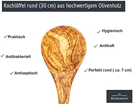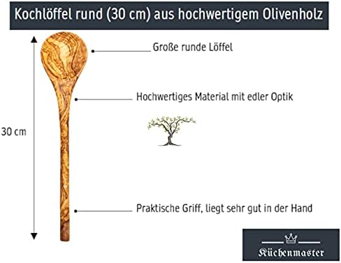 Cucchiaio da cucina in legno d’ulivo, lunghezza 30 cm, con testa rotonda e manico