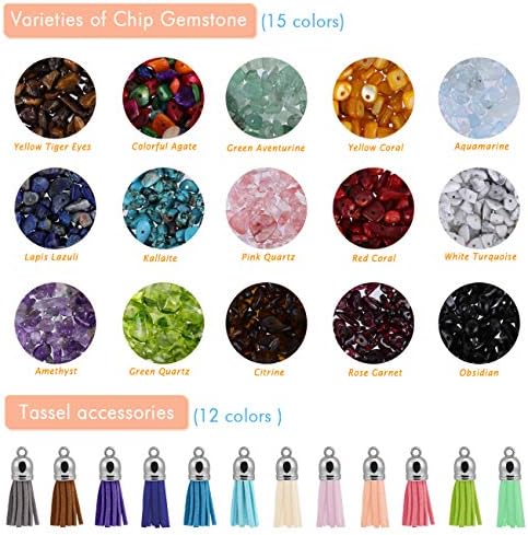 VARIETÀ DI COLORE E ACCESSORI: Questo perline pietre naturali kit include pietre di 15 colori, ricco assortimento. Anche gli accessori sono di multiple disponibilità, contengono le chiusure a moschettone, le frange di 12 colori, i cerchini, due rotoli di fili e delle mini perline. Bastano a soddisffare le vostre esigenze di design diversi stili di gioielli.