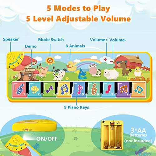 🐈【Design aggiornato】 Il tappeto pianoforte musicale produce un suono piacevole e chiaro. Volume regolabile a 5 livelli(Regola il volume premendo ”+”, ”-” tasti.), protegge l’udito del bambino e riduce il rumore. Con un effetto luce soffusa, proteggi gli occhi del bambino quando crei più divertimento.