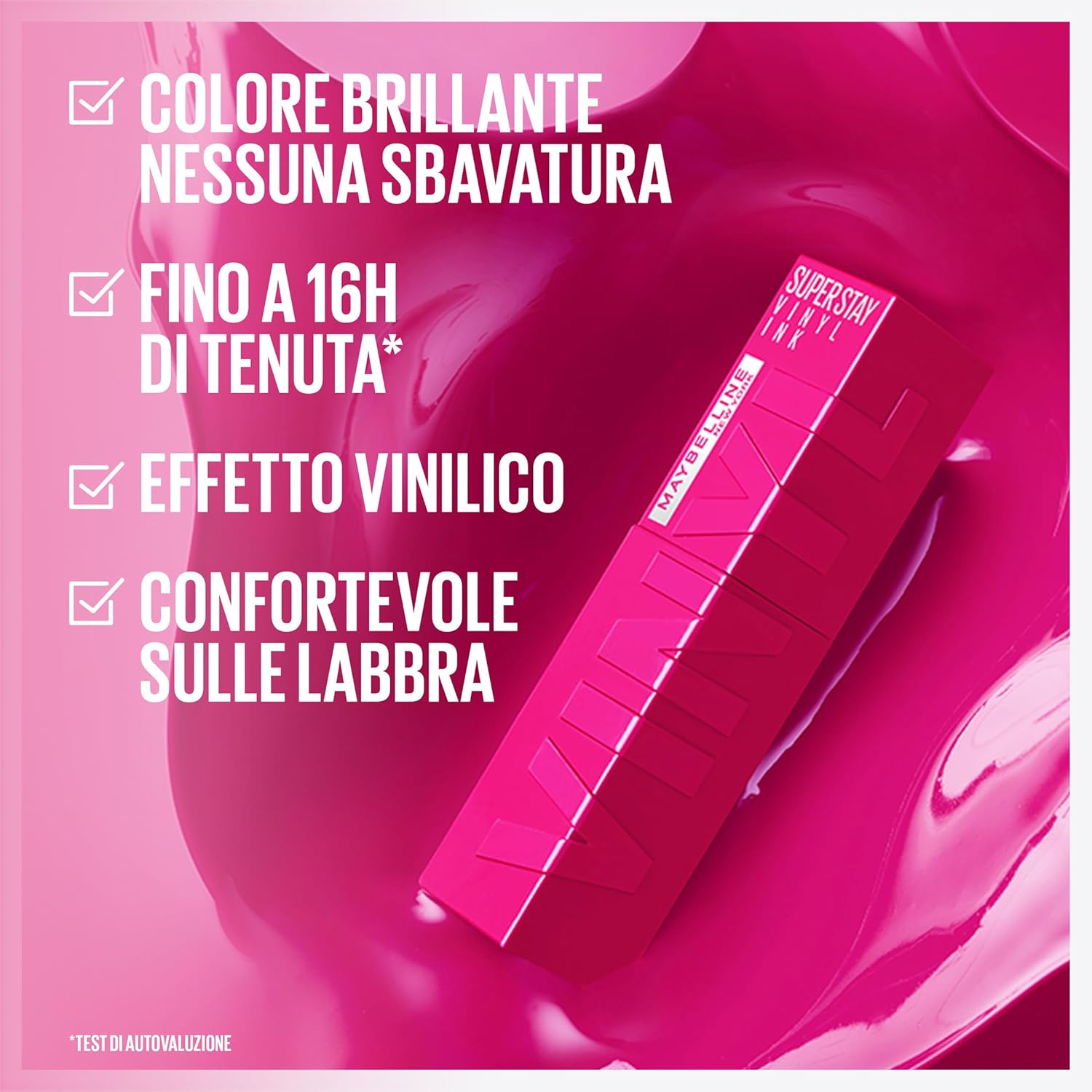 Rossetto liquido a lunga tenuta con finish vinilico e ad alto impatto per look labbra indimenticabili, No transfer e a prova di sbavature – Labbra dall’effetto vinilico e dal colore intenso, Aspetto luminoso e brillante all’istante, Sensazione confortevole, Dura fino a 16H*, *Test di autovalutazione su 109 soggetti – Agita per 5 secondi, applica sulle labbra asciutte partendo dal labbro superiore e seguendo i contorni della bocca, stendi poi sul labbro inferiore e lascia asciugare – Formula vegana senza ingredienti o derivati di origine animale, Applicatore preciso che fornisce colore e brillantezza ottimali in un’unica passata – Contenuto: 1x Maybelline New York Rossetto Liquido, Effetto Vinilico, Fino a 16H di Tenuta, Colore Brillante Senza Sbavature, Super Stay Vinyl Ink Pink Mix, Tonalità: 160 Sultry