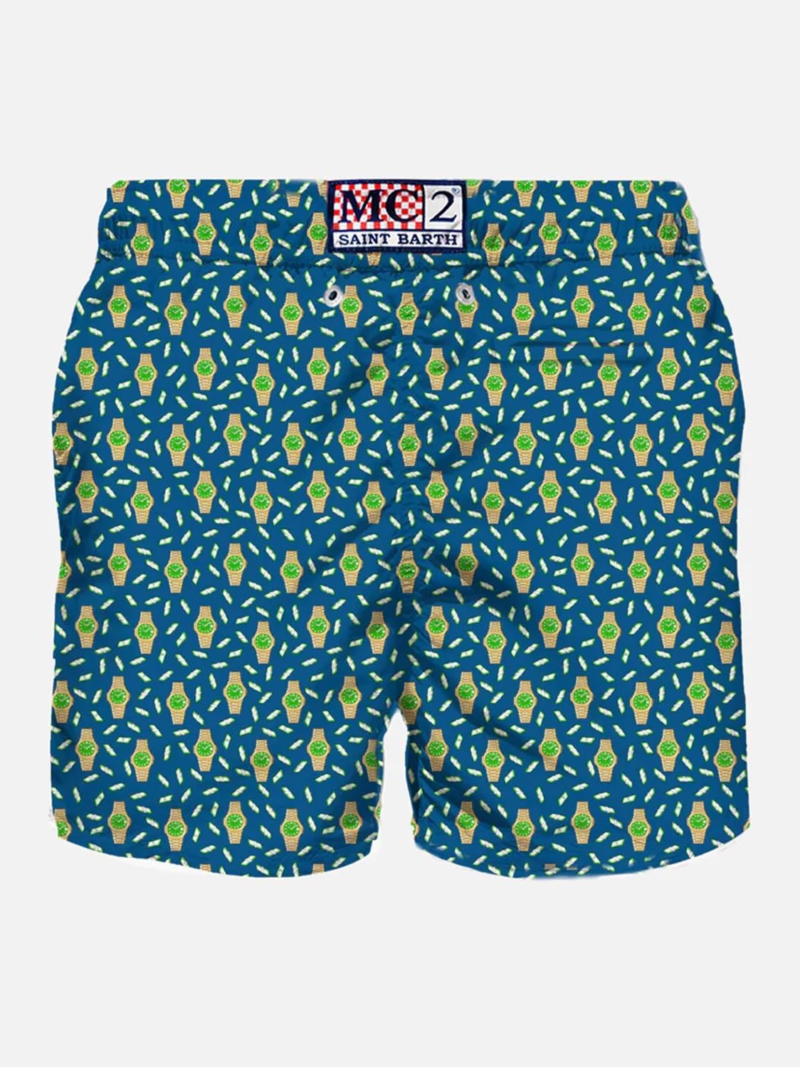 Pantaloncino da bagno Saint Barth, di media lunghezza modello “Lighting”, in tessuto leggero, asciugatura rapida. Stampa orologi. Comoda vita elasticizzata, cordoncino regolabile con terminalini marchiati, fodera interna in rete. Tasche laterali con cucitura alla francese. Tasca posteriore applicata con chiusura magnetica, occhielli firmati progettati per drenare l’acqua e prevenire l’effetto palloncino. Etichetta esclusiva MC2 Saint Barth sul retro. Vestibilità classica.