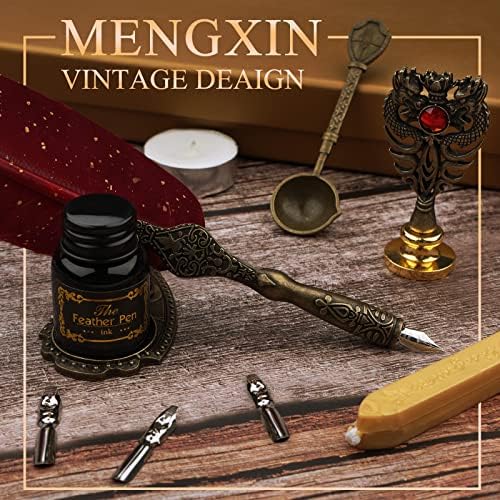 SET PENNE QUILL: penne calligrafiche per ufficio piuma, boccetta di inchiostro (inchiostro da 15 ml), timbro di cera vintage, pennini in acciaio inossidabile di 5 diverse dimensioni, cera laccata, base del pennino, cera bianca, cucchiaio, confezione regalo