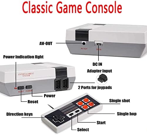 Descrizione del prodotto Giochi TV super classici: la console di gioco TV retrò con 620 giochi integrati, non è necessario inserire carte o scaricare giochi. tra cui Contra, Tetris 2, PAC-Man, Street Fighter e altri migliori giochi dagli anni ’80 agli anni ’90. Console classica: console di gioco classica e 2 driver, specifiche: tipo di gioco: gioco d’azione. Versione del gioco: versione semplificata. Memoria: 620 giochi integrati. Processore di immagine: 8 bit. Uscita: DC 6 V-150 mA Stato TV: uscita AV. Suggerimenti: assicurati che il tuo televisore/schermo abbia porte di ingresso AV, la qualità dell’immagine di gioco a 8 bit non è così chiara come i giochi di oggi. (Non funziona con HDMI)