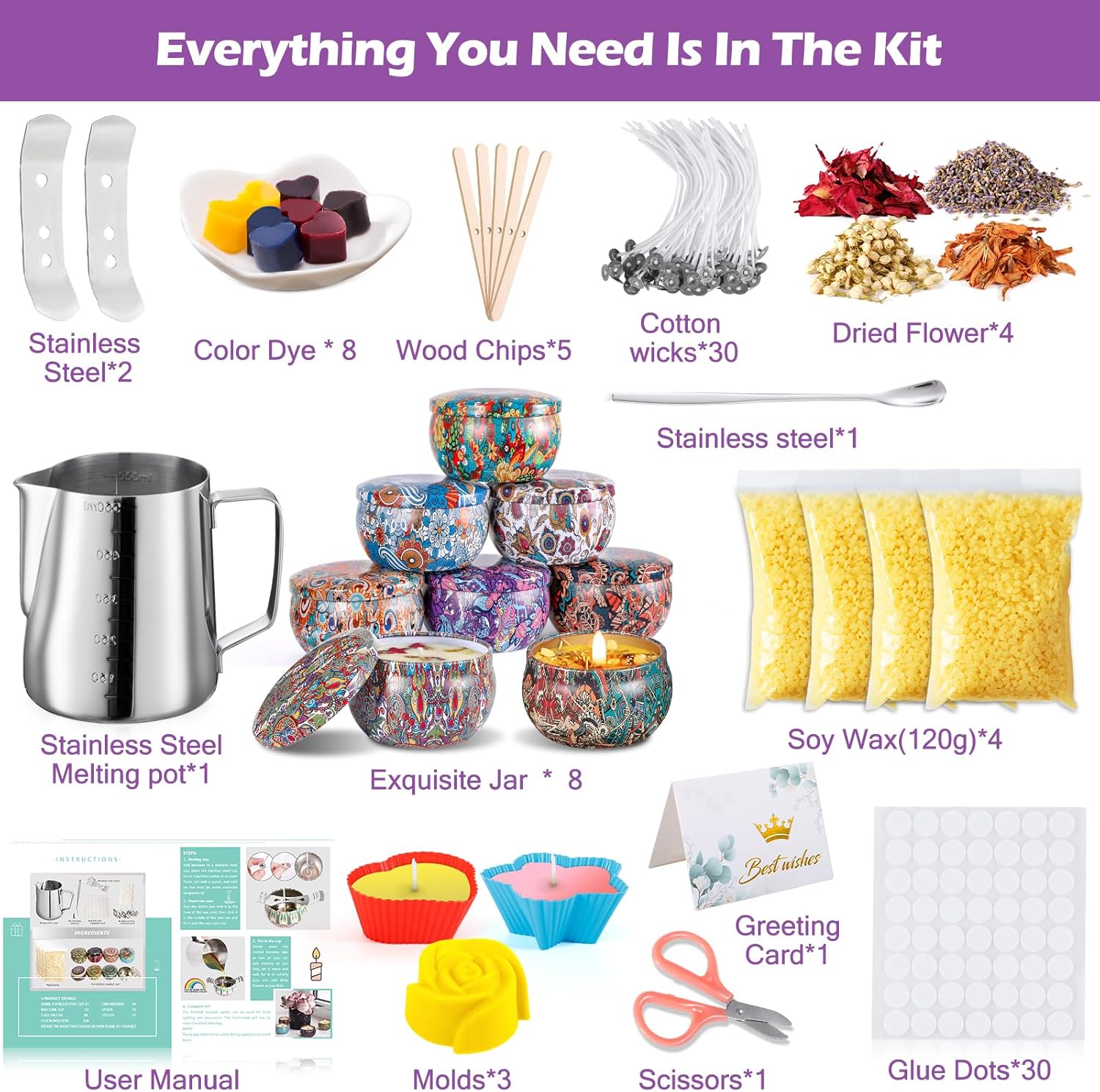 NCKIHRKK Kit per Fabbricazione Candele Fai da Te, per Fusione Cera per Principianti DIY Set Regalo con Cera di Soia, 8 barattoli, 8 Coloranti, 3 Stampo in Silicone, 30 Stoppini