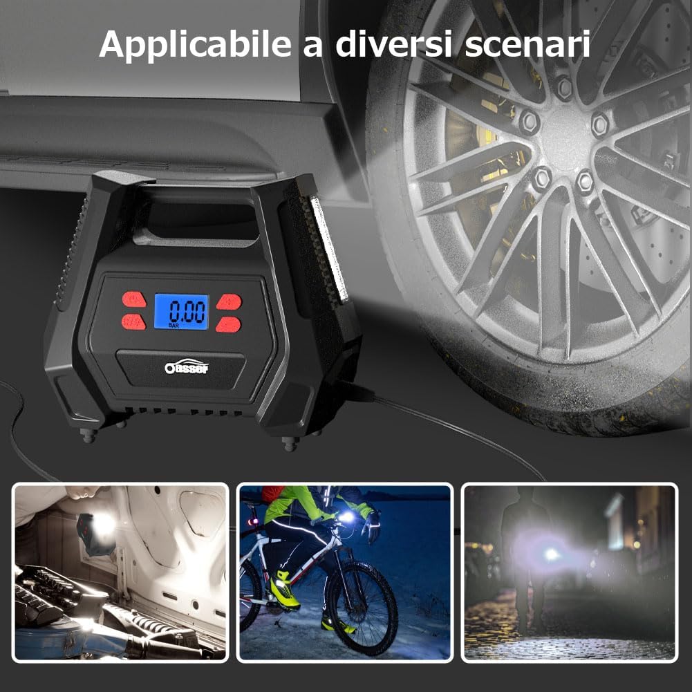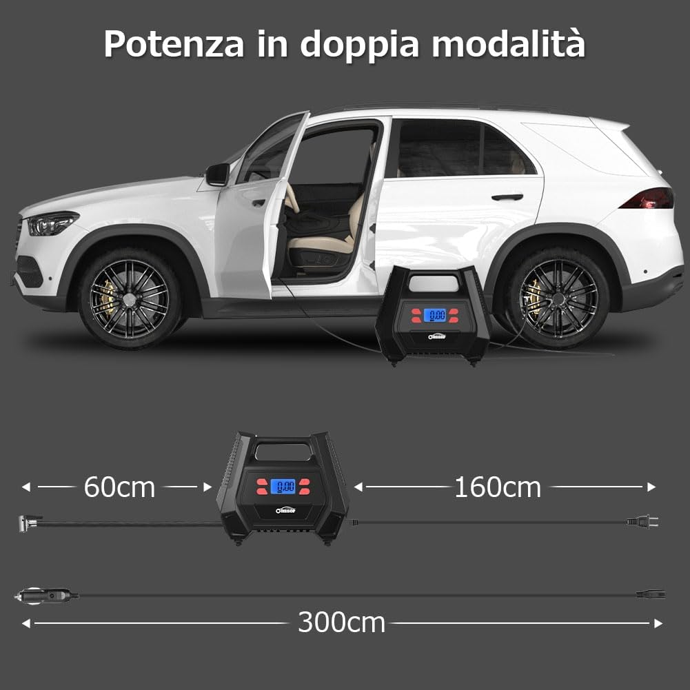 1.Dual Mode Power Supply: oasser portable air compressor works with AC/DC dual mode power, allows you to charge your oasser portable air compressor inflator in your car or home. There are preset pressure and auto shutdown function, just set the pressure value you need, when the desired pressure is reached, oasser portable air compressor pump will automatically turn off.
